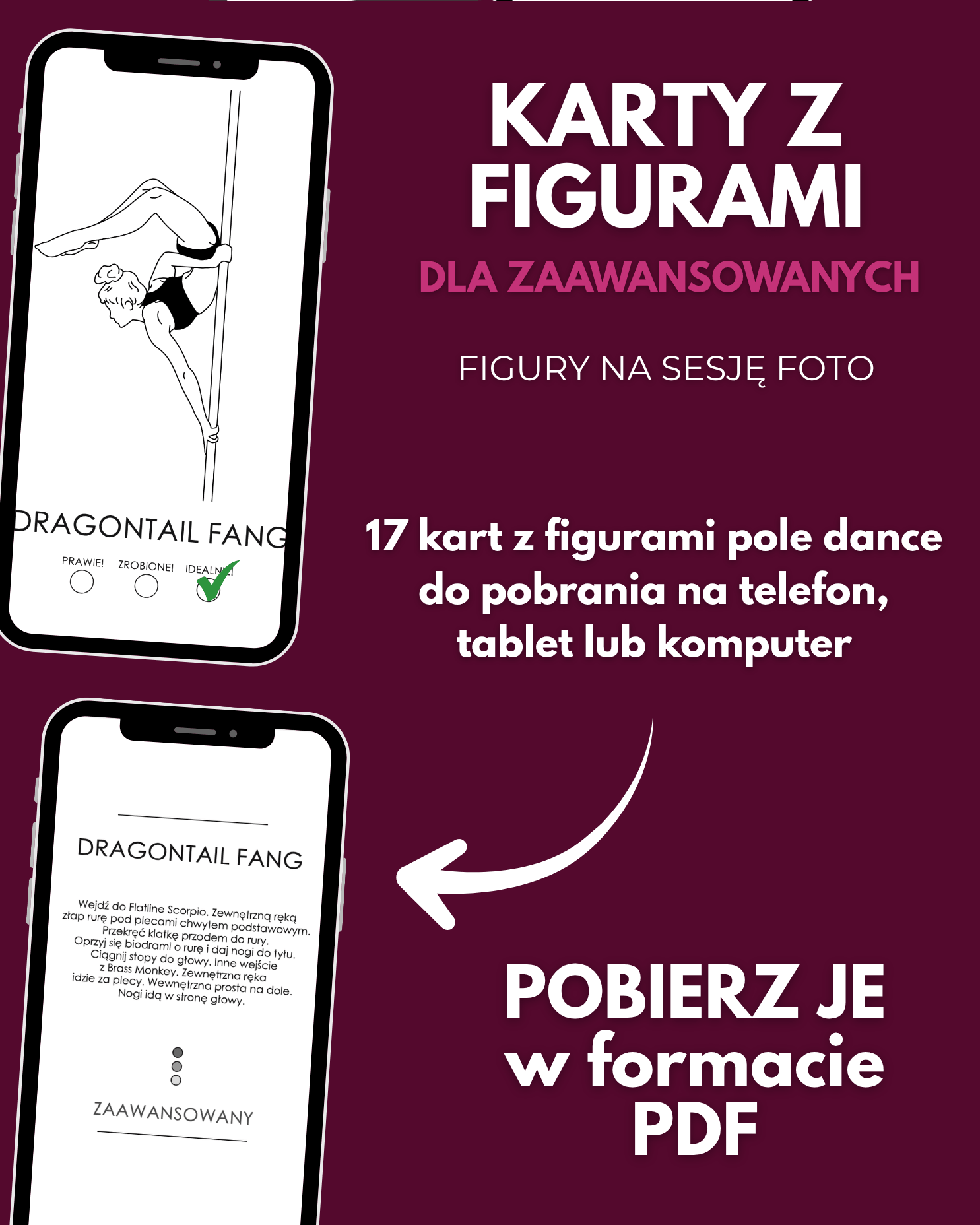 Cyfrowa wersja naszych kart z figurami pole dance. Pobierz je w formacie PDF i korzystaj, kiedy chcesz, miej zawsze przy sobie :) odhaczaj progres dzięki kółkom: prawie, zrobione, idealnie. Kolekcjonuj figurki z różnych poziomów: beginner, intermediate i advanced.